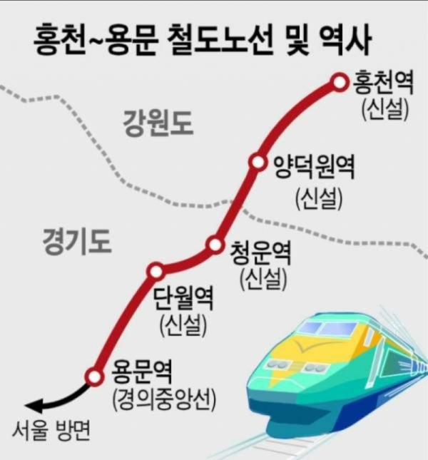 이번에 타당성을 확보한 용문~홍천 광역철도 사업은 양평군 용문역에서 강원특별자치도 홍천군까지 총연장 32.7km를 잇는 단선 광역철도 노선으로, 총사업비는 약 1조 1천억 원 규모다. 해당 노선은 강원권 최초의 광역철도로, 수도권 동부와 강원 내륙을 연결하는 핵심 교통 인프라로 평가받고 있다.