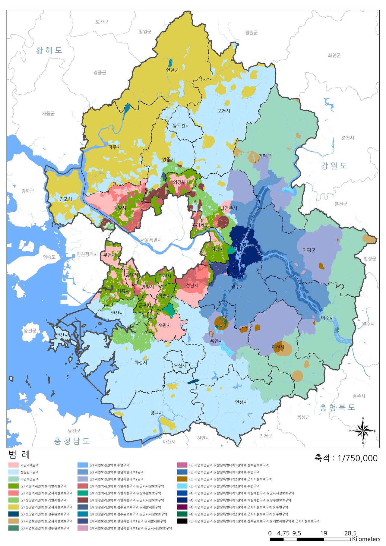규제지도에 따르면 도는 수도권 규제(전 지역, 10,199㎢), 팔당특별대책지역(2,096㎢), 개발제한구역(1,131㎢), 상수원보호구역(190㎢), 수변구역(143㎢), 군사시설보호구역(2,251㎢) 등의 규제를 받고 있다.