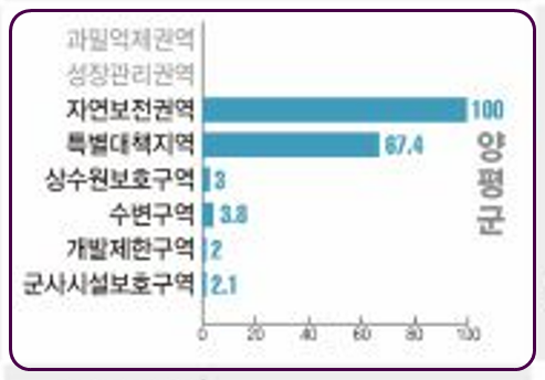 양평, 가평, 여주, 광주, 이천, 남양주 등 경기 동부지역의 경우 ▲자연보전권역과 특별대책지역 ▲상수원보호구역 ▲수변구역 이외에도 공장설립제한지역과 배출시설설치제한지역 등 각종 규제를 중복해서 적용받고 있다.