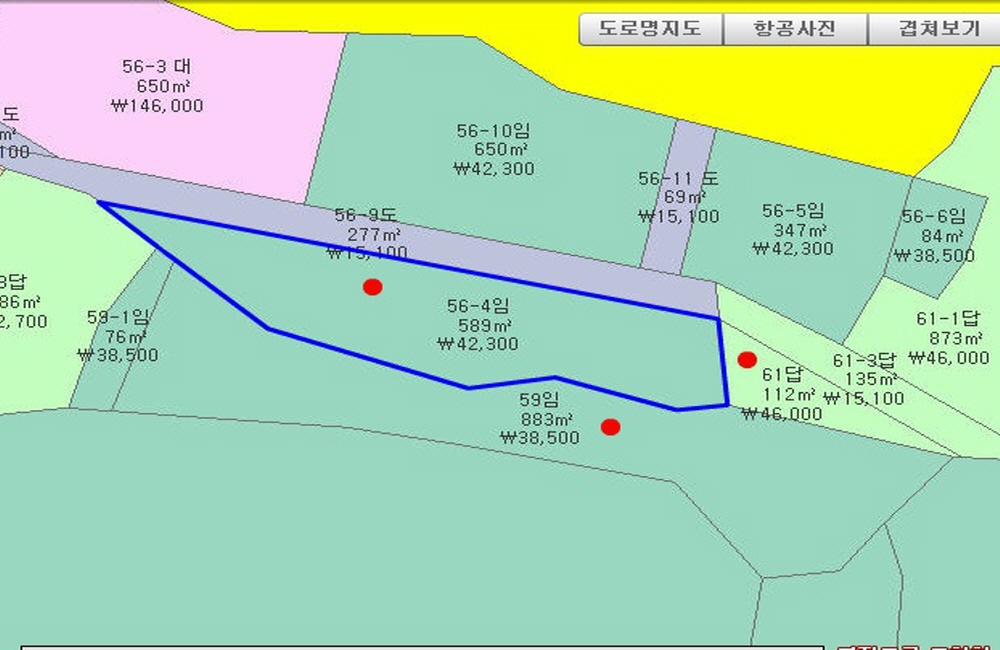 | 상태 | 종중산 산자락에 접한 완경사지 다각형의 토지로, 서쪽으로 길게 뻗은 토지로 기본토목 필요하며 아스콘 포장되어 있습니다 | ||